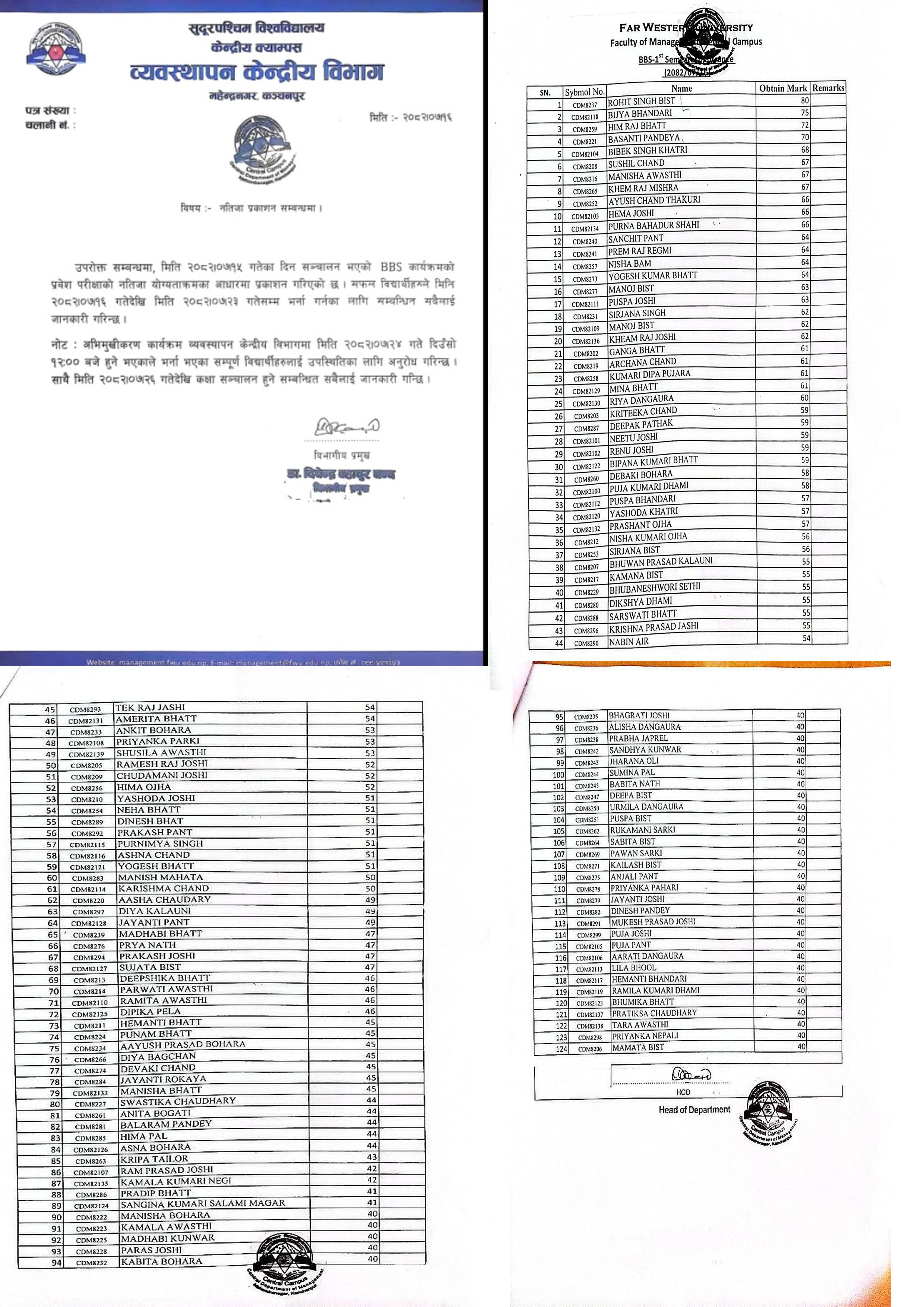 शैक्षिक सत्र २०८२/०८३ को नयाँ भर्नाका लागि मिति २०८२-०७-१५ का दिन लिईएको BBS को प्रवेश परीक्षाको नतिजा प्रकाशित गरिएको बारे
