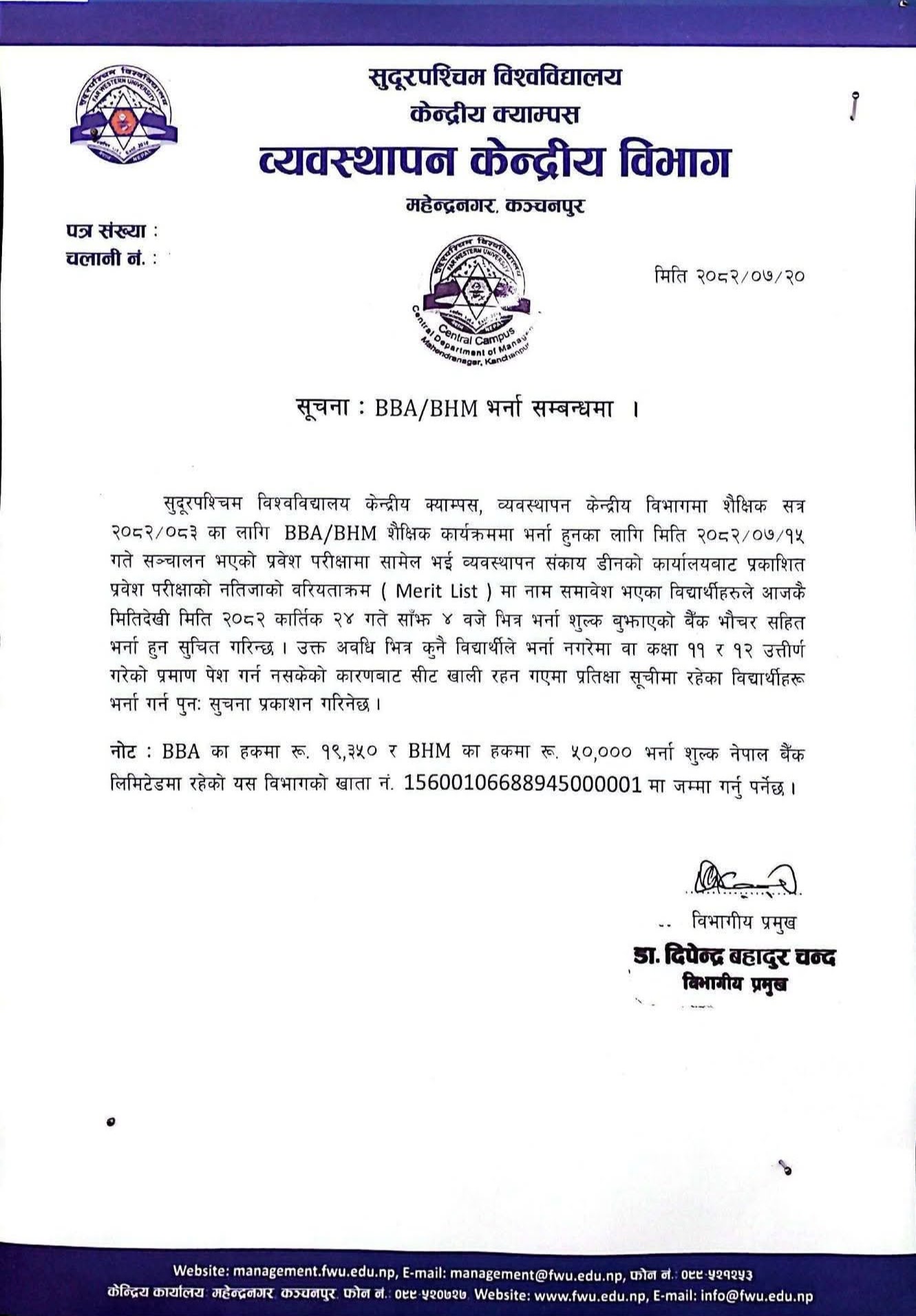 BBA&BHM प्रथम सेमेस्टरको भर्ना म्याद सम्बन्धमा