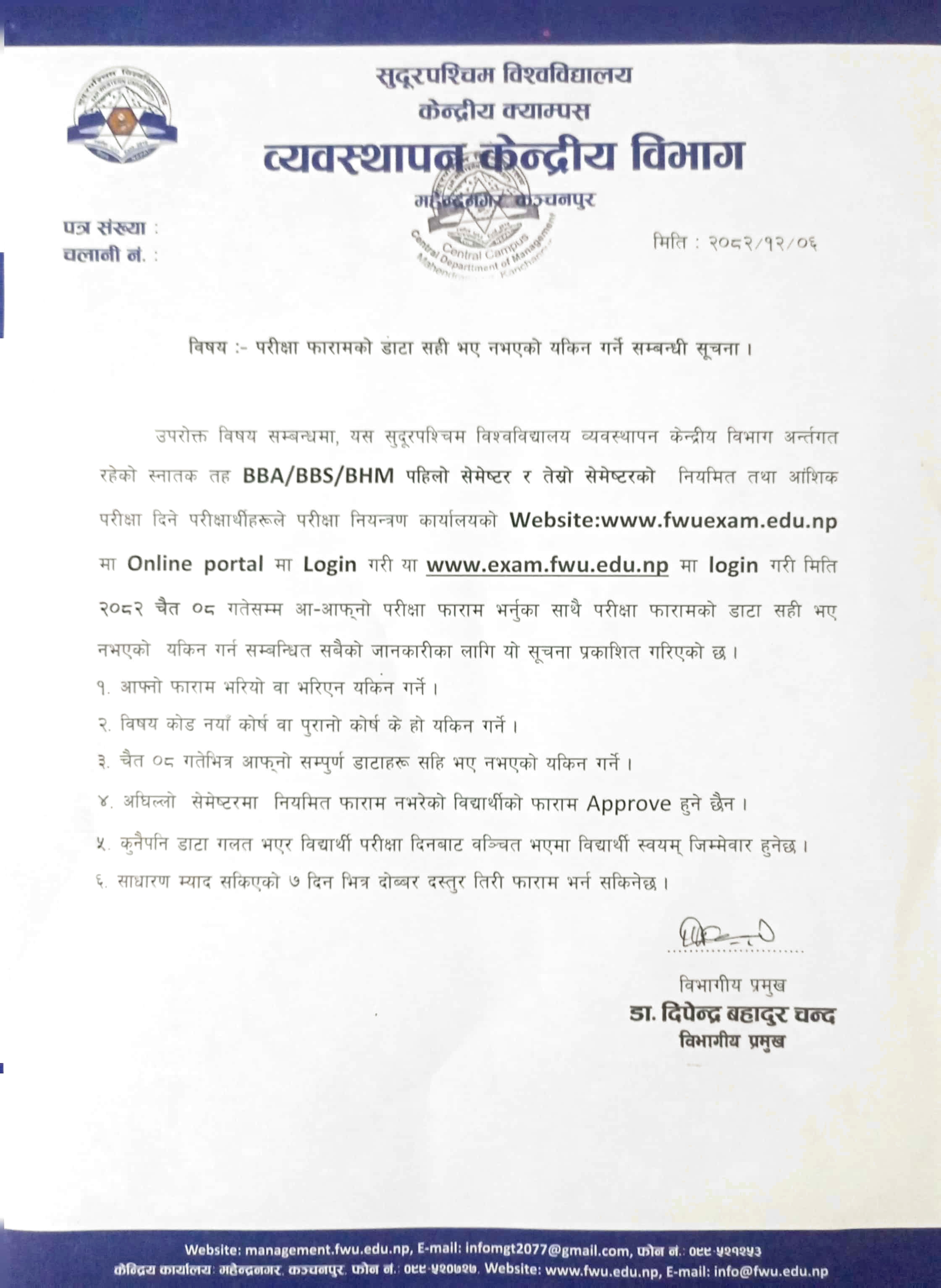 परिक्षा फारमको डाटा सहि भए नभएको यकिन गर्ने सम्बन्धी सूचना।
